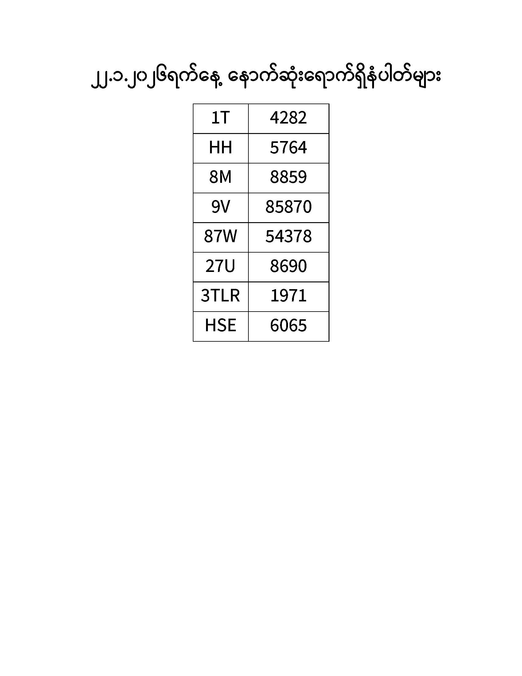 ၂၂.၁.၂၀၂၆ ရက်နေ့ထိ နောက်ဆုံးရောက်ရှိ နံပါတ်များ Published: 23 Jan, 2026 Place: ကုန်းလမ်းပို့ဆောင်ရေးညွှန်ကြားမှုဦးစီးဌာန