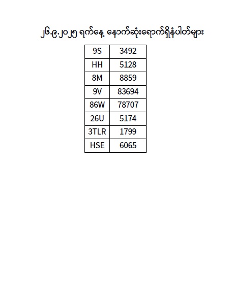 ၂၆.၉.၂၀၂၅ ရက်နေ့ထိ နောက်ဆုံးရောက်ရှိ နံပါတ်များ Published: 29 Sep, 2025 Place: ကုန်းလမ်းပို့ဆောင်ရေးညွှန်ကြားမှုဦးစီးဌာန