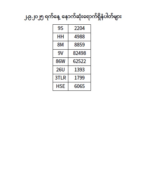 ၂.၉.၂၀၂၅ ရက်နေ့ထိ နောက်ဆုံးရောက်ရှိ နံပါတ်များ Published: 03 Sep, 2025 Place: ကုန်းလမ်းပို့ဆောင်ရေးညွှန်ကြားမှုဦးစီးဌာန