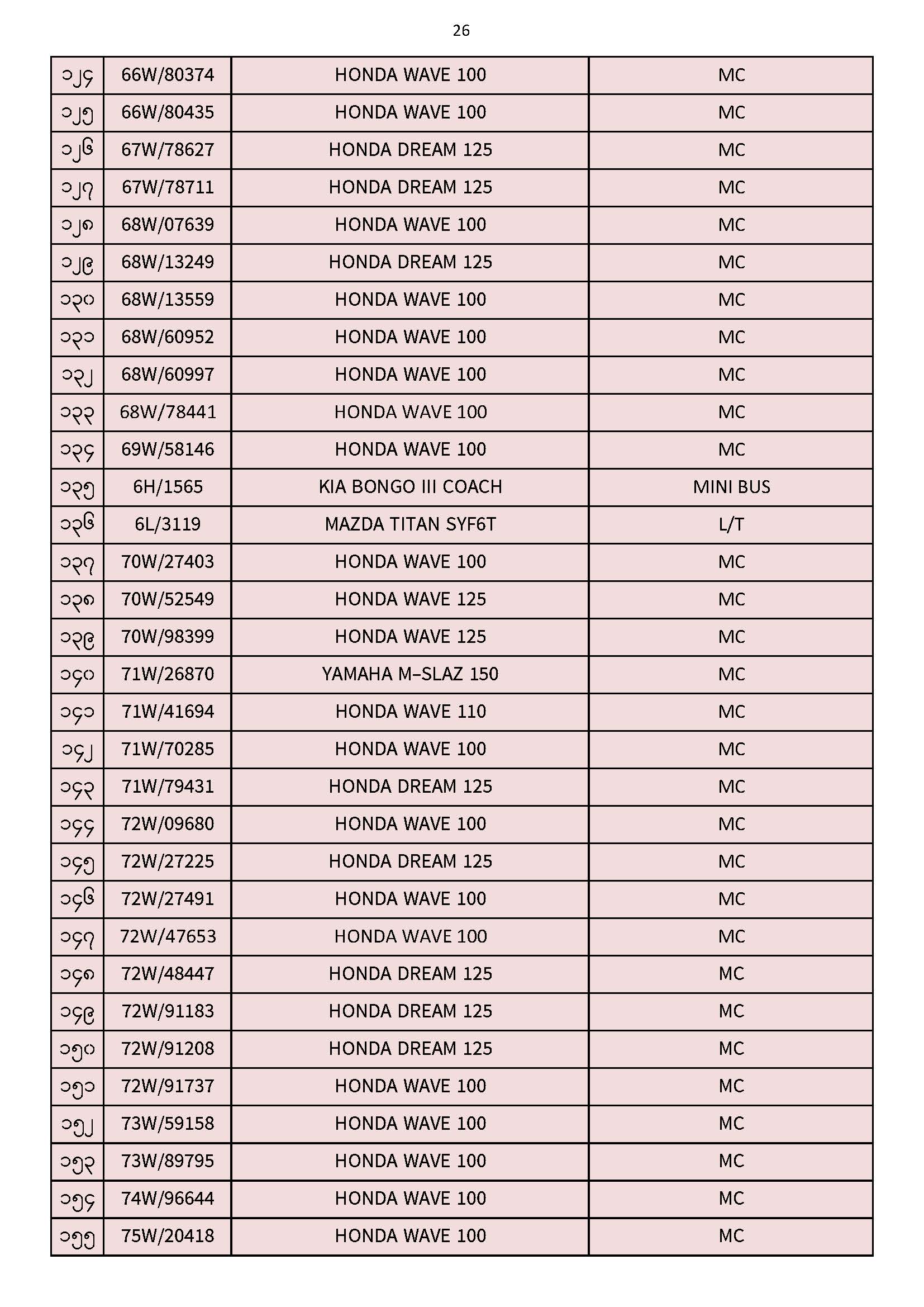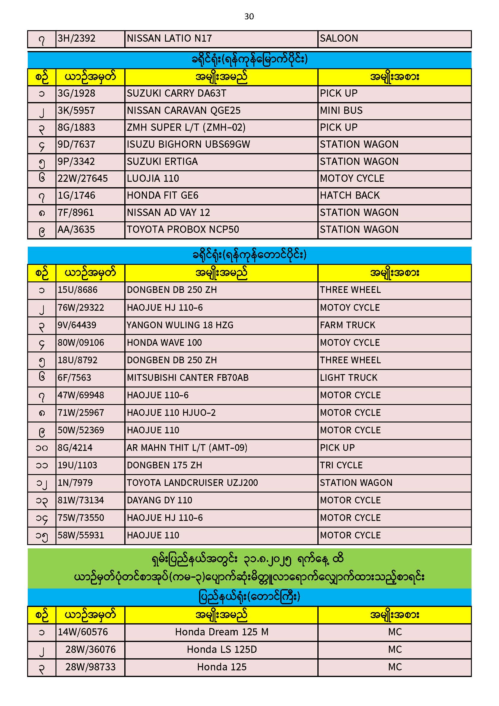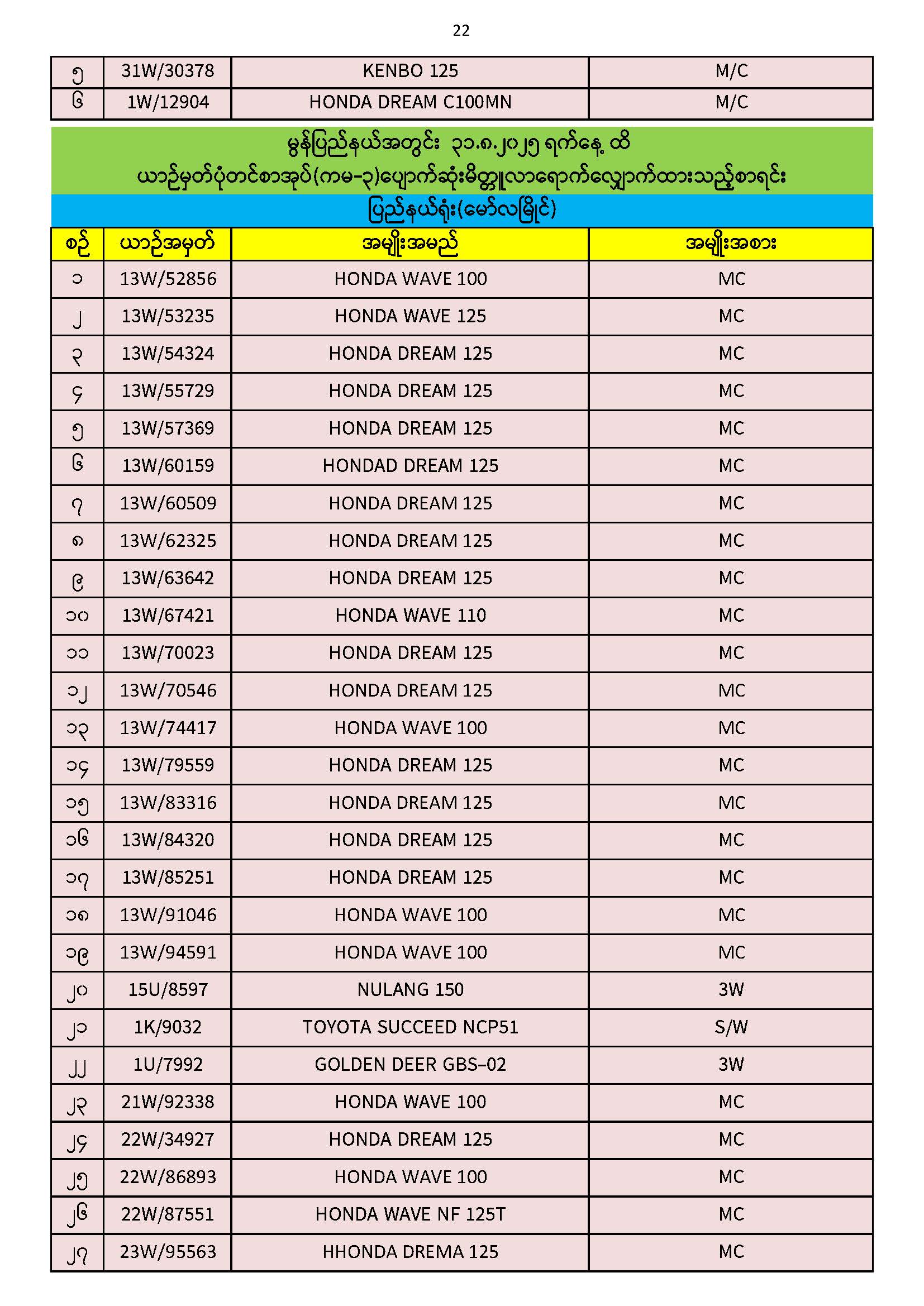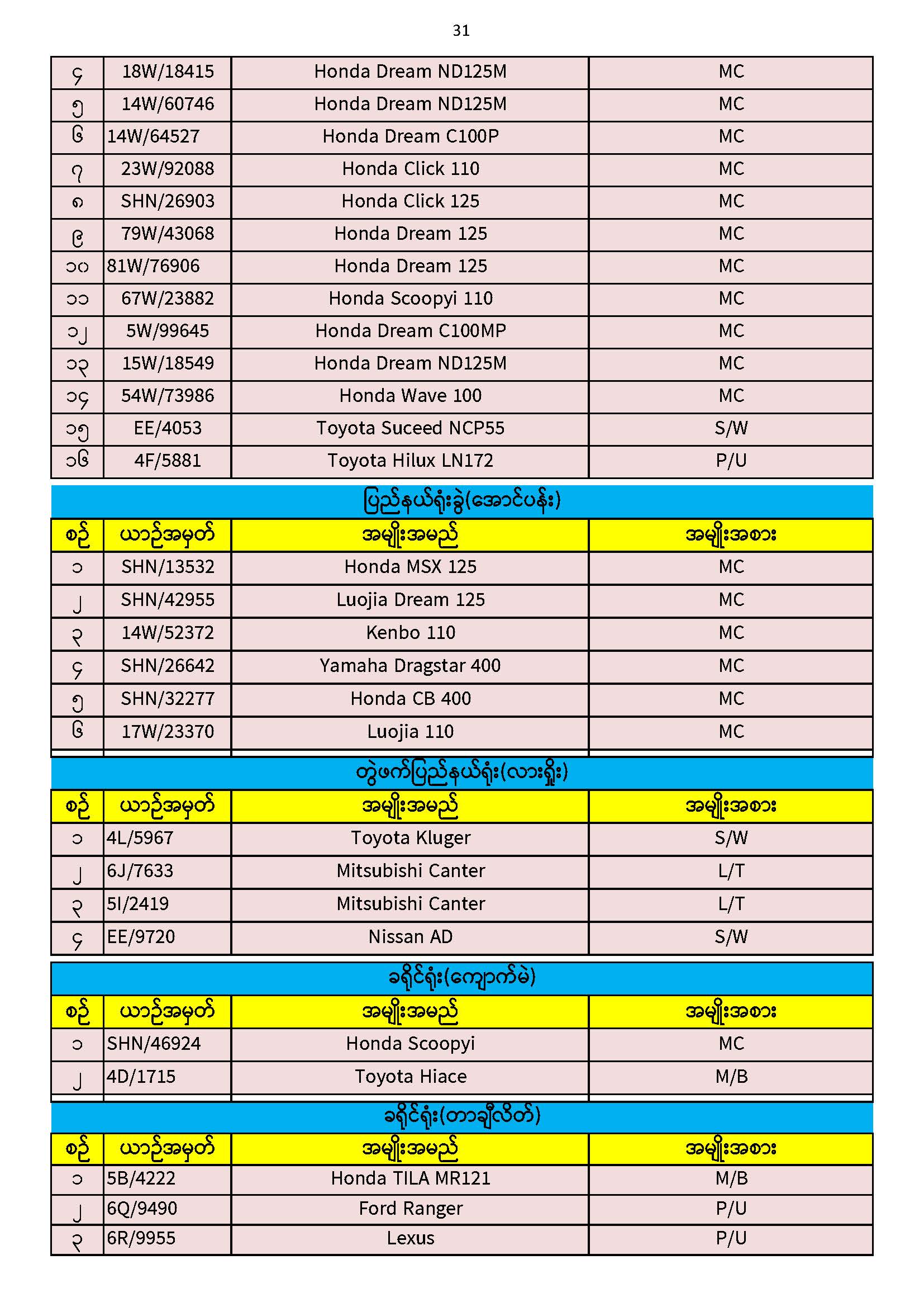 ၃၁.၈.၂၀၂၅ ရက်နေ့ထိ ယာဉ်မှတ်ပုံတင်စာအုပ်(ကမ-၃) ပျောက်ဆုံးမိတ္တူလာရောက် လျှောက်ထားသည့်စာရင်း Published: 04 Sep, 2025 Place: ကုန်းလမ်းပို့ဆောင်ရေးညွှန်ကြားမှုဦးစီးဌာန