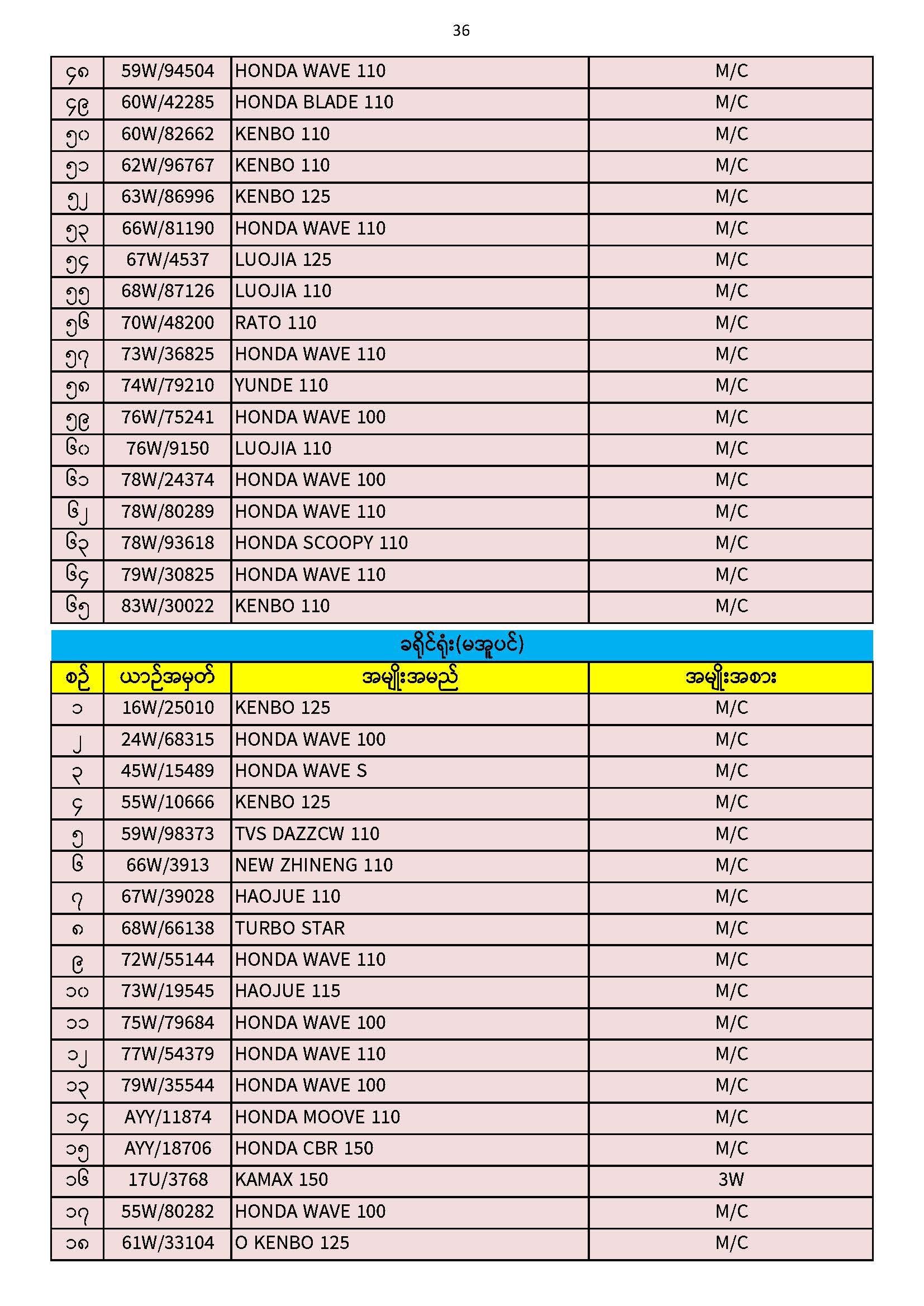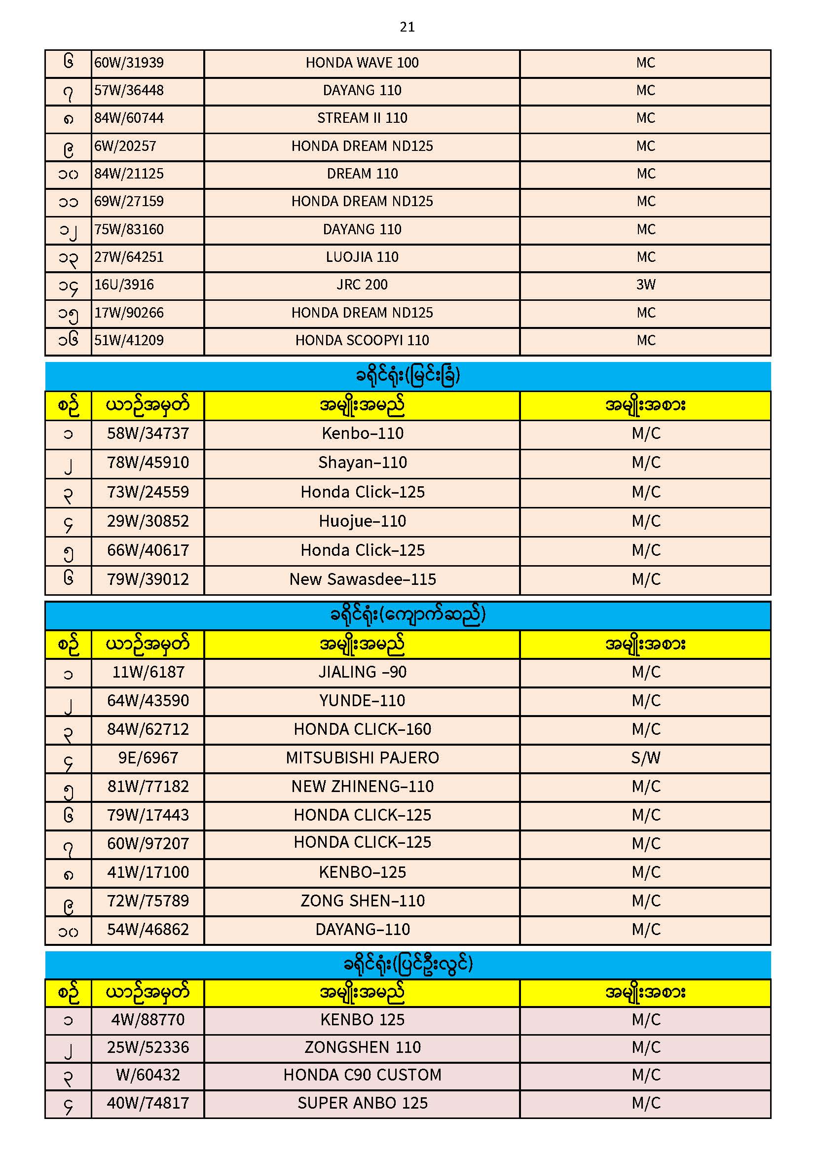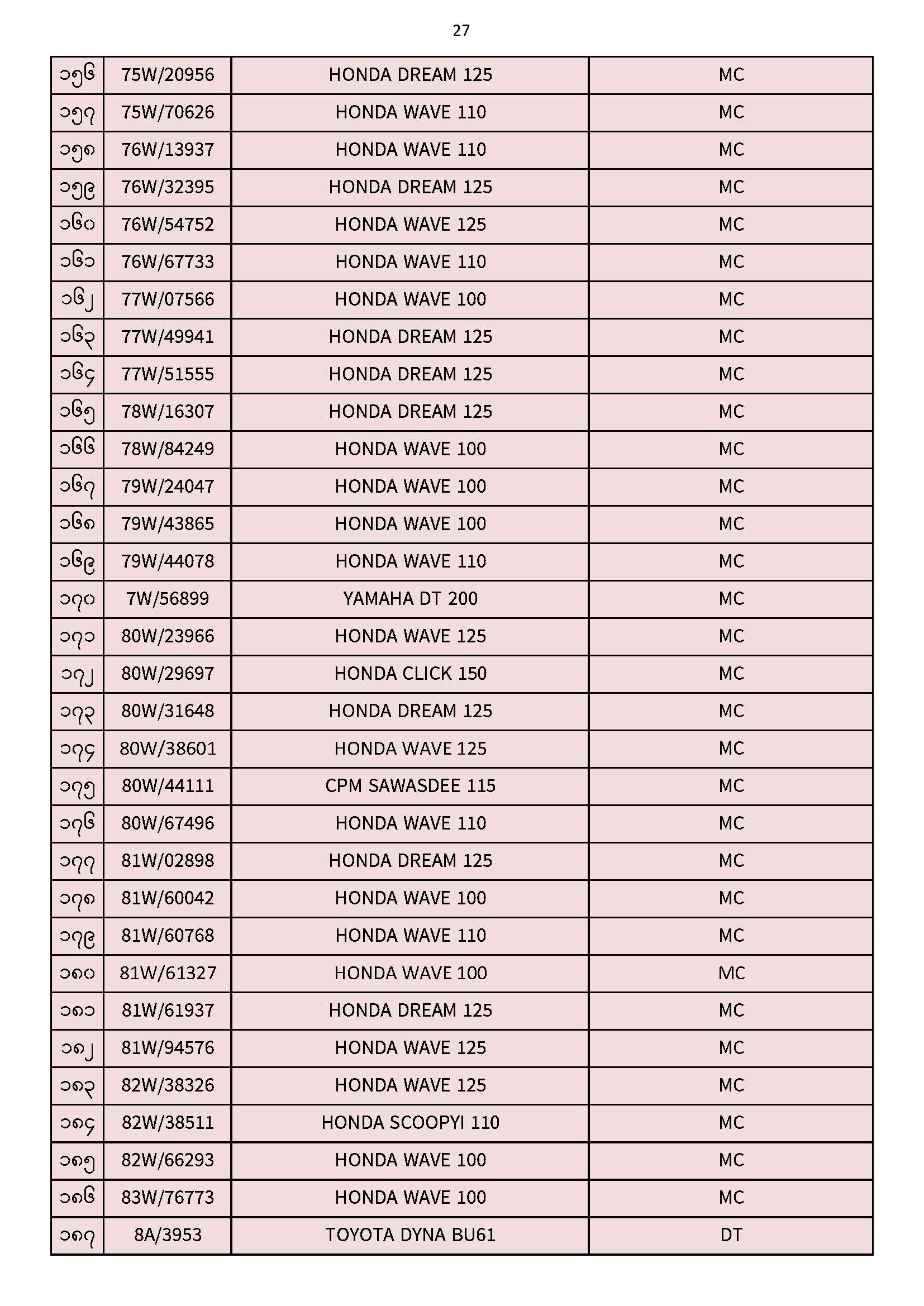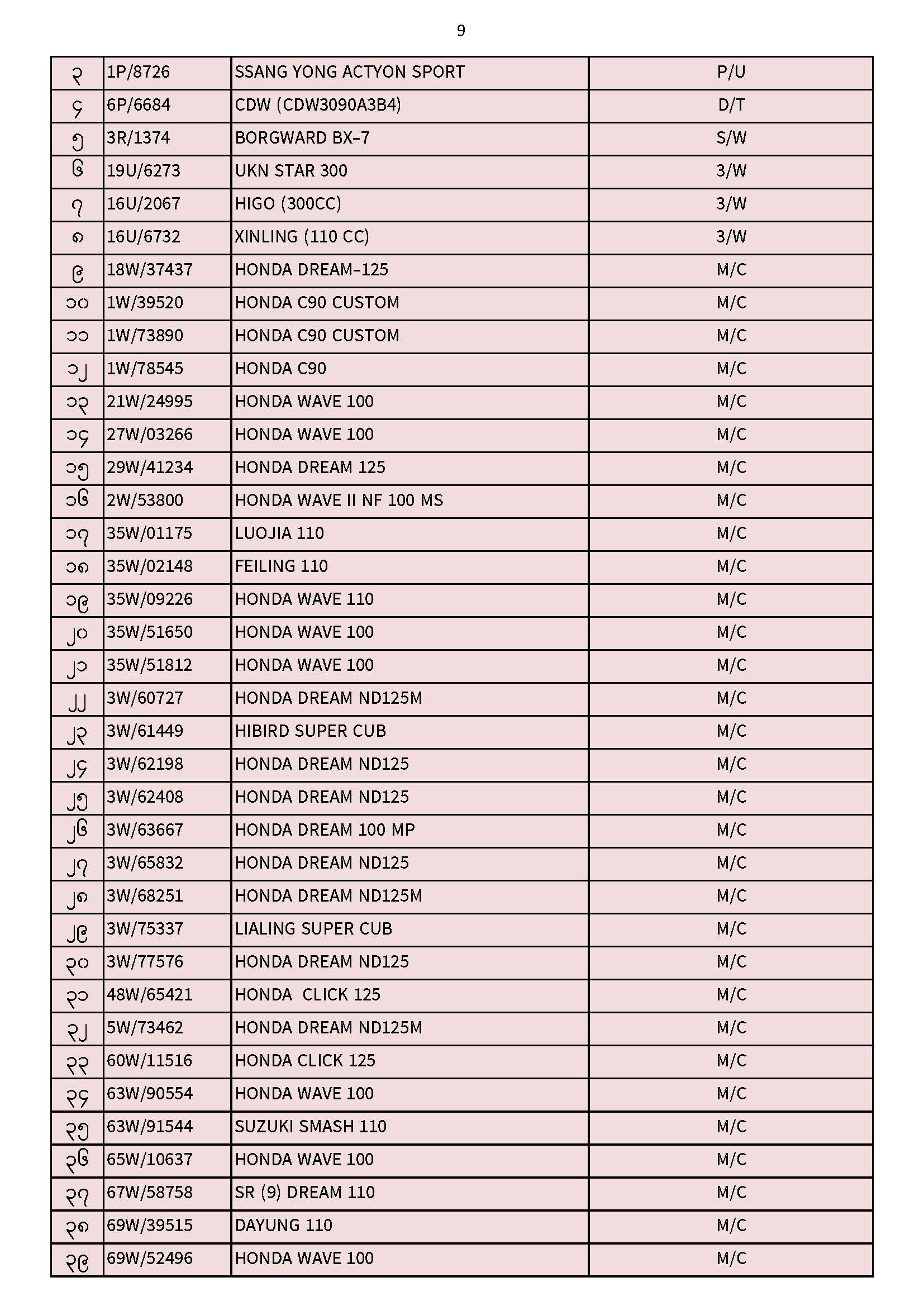 ၃၁.၈.၂၀၂၅ ရက်နေ့ထိ ယာဉ်မှတ်ပုံတင်စာအုပ်(ကမ-၃) ပျောက်ဆုံးမိတ္တူလာရောက် လျှောက်ထားသည့်စာရင်း Published: 04 Sep, 2025 Place: ကုန်းလမ်းပို့ဆောင်ရေးညွှန်ကြားမှုဦးစီးဌာန
