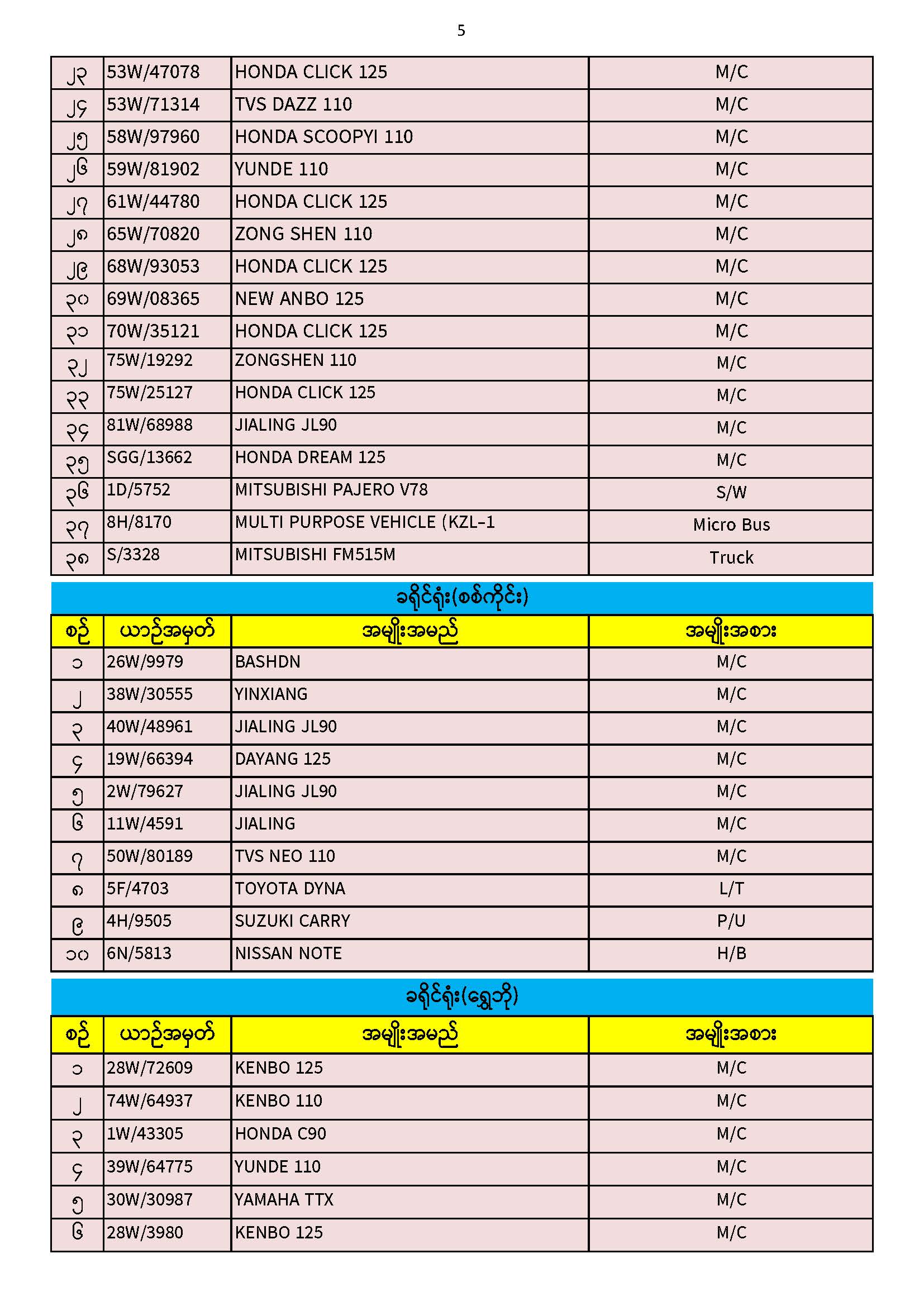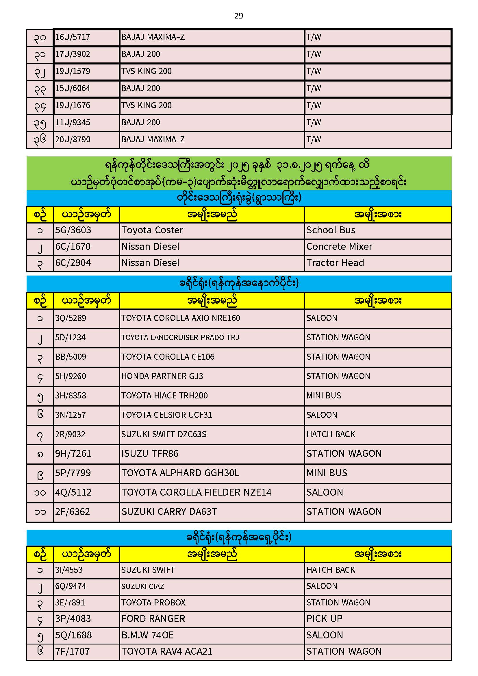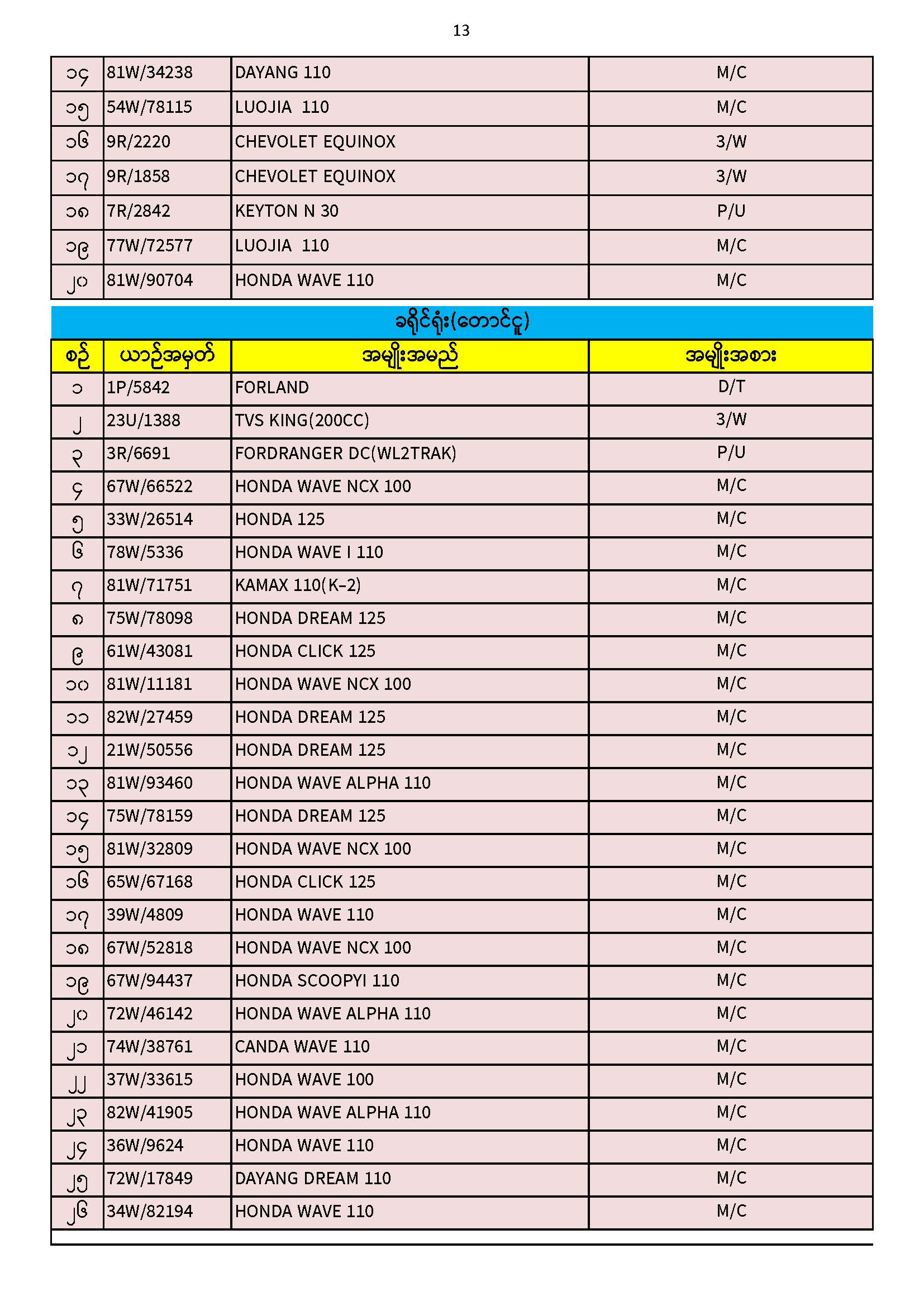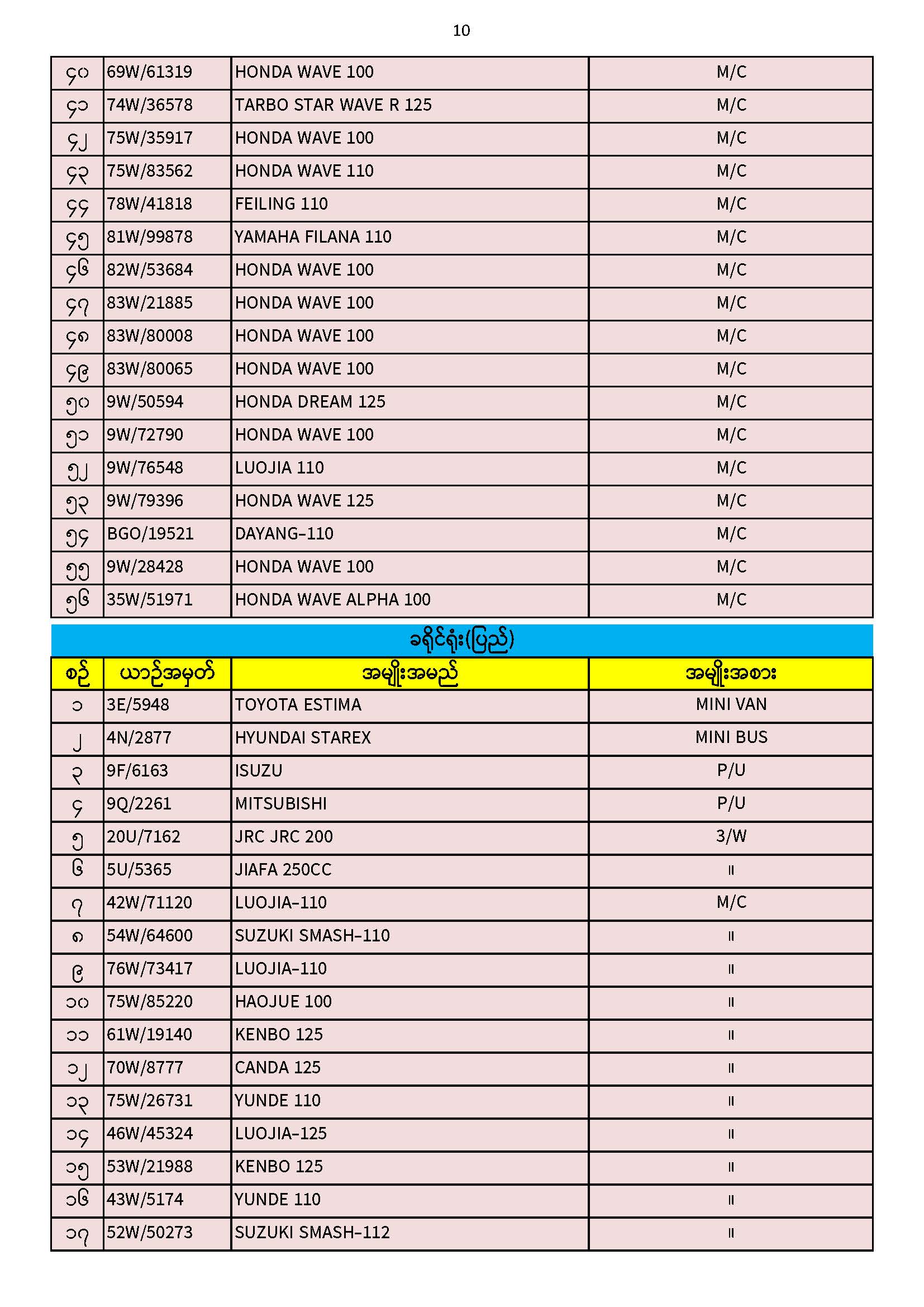 ၃၁.၈.၂၀၂၅ ရက်နေ့ထိ ယာဉ်မှတ်ပုံတင်စာအုပ်(ကမ-၃) ပျောက်ဆုံးမိတ္တူလာရောက် လျှောက်ထားသည့်စာရင်း Published: 04 Sep, 2025 Place: ကုန်းလမ်းပို့ဆောင်ရေးညွှန်ကြားမှုဦးစီးဌာန