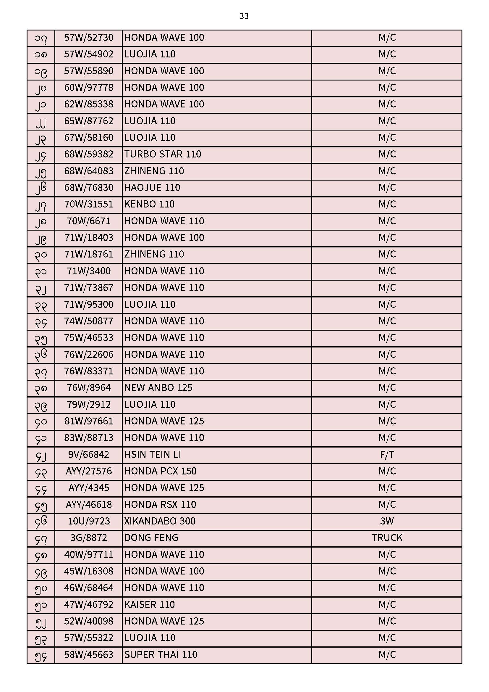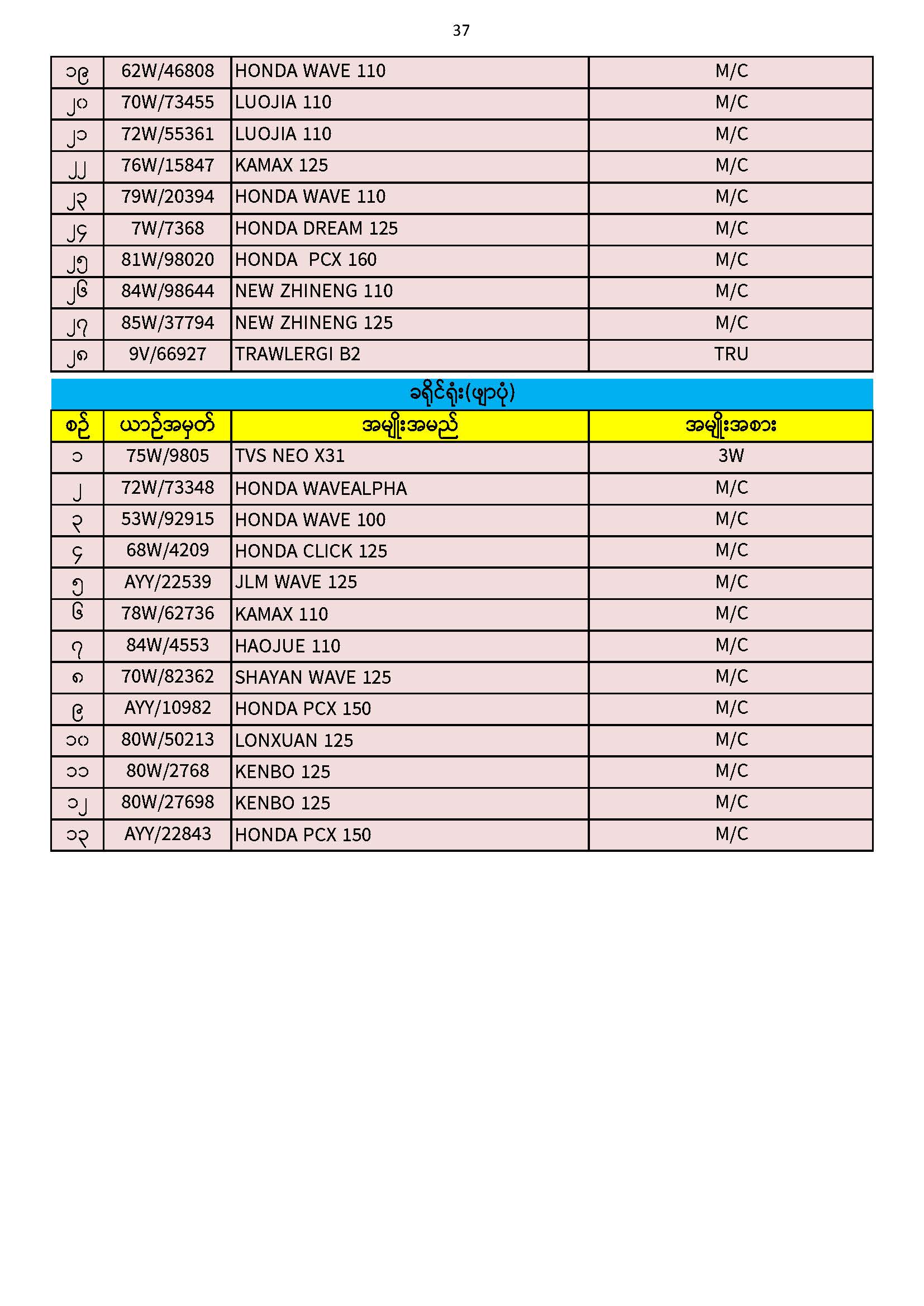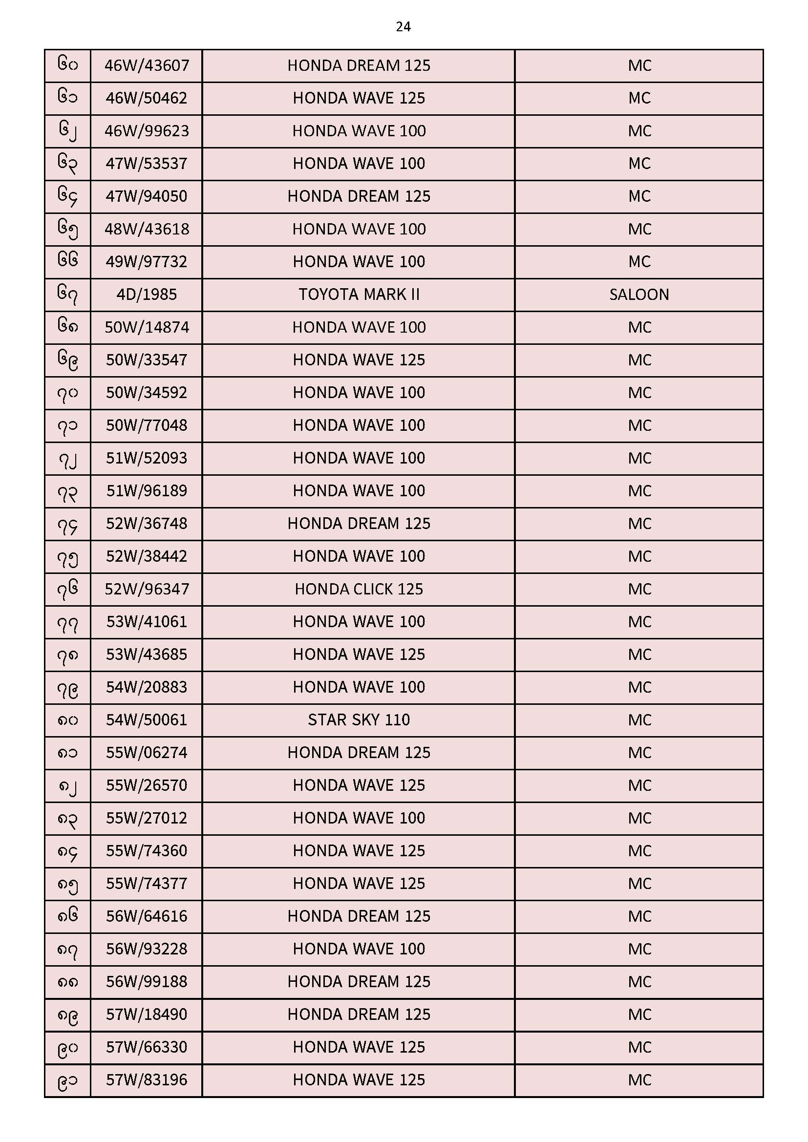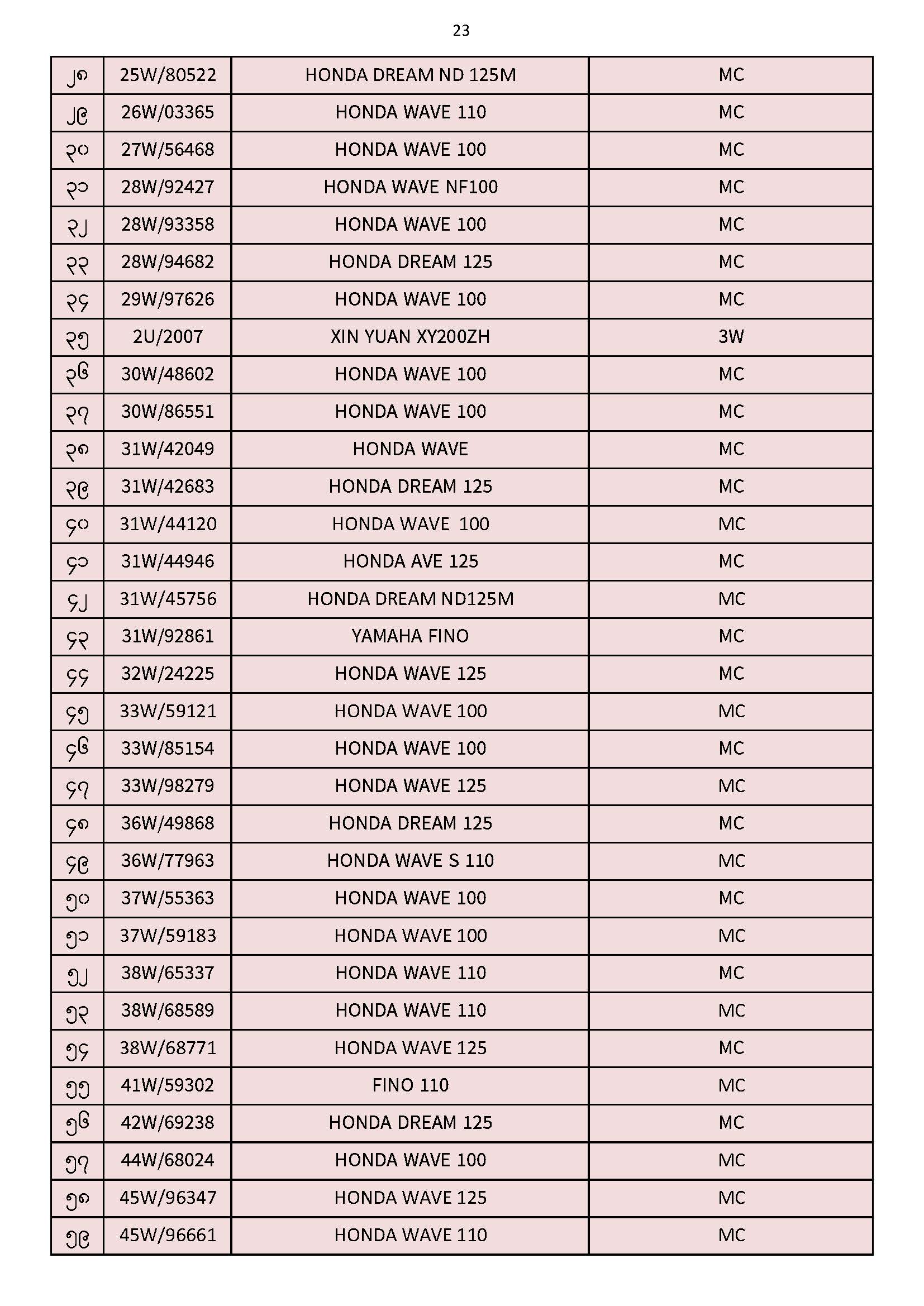 ၃၁.၈.၂၀၂၅ ရက်နေ့ထိ ယာဉ်မှတ်ပုံတင်စာအုပ်(ကမ-၃) ပျောက်ဆုံးမိတ္တူလာရောက် လျှောက်ထားသည့်စာရင်း Published: 04 Sep, 2025 Place: ကုန်းလမ်းပို့ဆောင်ရေးညွှန်ကြားမှုဦးစီးဌာန