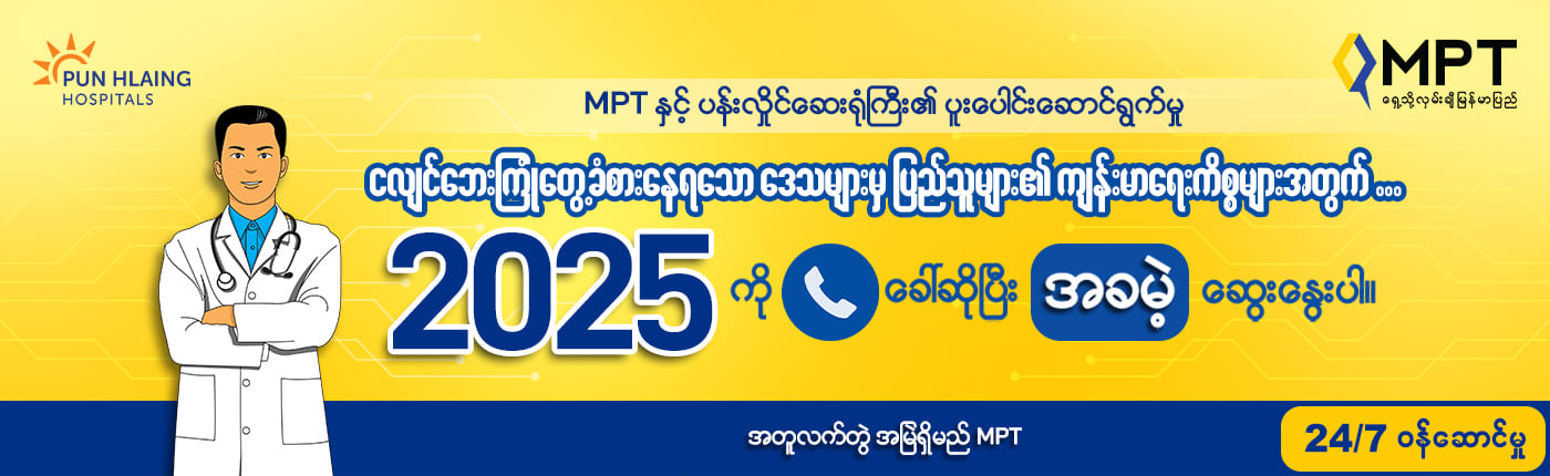 ၂၀၂၅ ခုနှစ်၊ မေလ (၂) ရက်မှစ၍ အဆိုပါဒေသများရှိ MPT GSM ဆင်းမ်ကတ် သုံးစွဲသူများသည် ပန်းလှိုင်ဆေးရုံကြီးမှ အသိအမှတ်ပြုလက်မှတ်ရရှိထားသော ဆရာဝန်များနှင့် တိုင်ပင်ဆွေးနွေးမှုကို အချိန်မရွေး ရယူနိုင်ရန် ၂၀၂၅ သို့ အခမဲ့ဖုန်းခေါ်ဆိုနိုင်ပါသည်။
