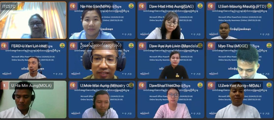 ပို့ဆောင်ရေးနှင့်ဆက်သွယ်ရေးဝန်ကြီးဌာန၊ သတင်းအချက်အလက်နည်းပညာနှင့်ဆိုက်ဘာလုံခြုံရေးဦးစီးဌာန၊ သင်တန်းကျောင်း၏ ၂၀၂၅-၂၆ ဘဏ္ဍာရေးနှစ်အတွင်း၊ ဒုတိယအကြိမ် Online Security Awareness (Online) သင်တန်းနှင့် Microsoft PowerPoint 2019 (Online) သင်တန်းများ၏ သင်တန်းဖွင့်ပွဲကို စက်တင်ဘာလ ၈ ရက်နေ့ နံနက်ပိုင်းတွင် ရုံးအမှတ် ၂ ၊ စာသင်ခန်းမ ၁ တွင် ကျင်းပပြုလုပ်ရာ သတင်းအချက်အလက်နည်းပညာနှင့် ဆိုက်ဘာလုံခြုံရေးဦးစီးဌာန၊ သတင်းအချက်အလက်နည်းပညာနှင့် ဆိုက်ဘာလုံခြုံရေးသင်တန်းကျောင်း၊ ကျောင်းအုပ်ကြီး ဒေါ်နှင်းခိုင်အေးနှင့်တကွ သင်တန်းဆရာ/ဆရာမများ၊ သင်တန်းအထောက်အကူပြု တာဝန်ခံများ၊ ပြည်ထောင်စုအဆင့် အဖွဲ့အစည်းများနှင့် ပြည်ထောင်စုဝန်ကြီးဌာန များမှ သင်တန်းသား/သင်တန်းသူ စုစုပေါင်း ၇၀ ဦး တို့ တက်ရောက်ကြောင်း သိရှိရပါသည်။