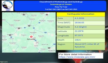 မြေငလျင်သတင်း၂၀၂၆ ခုနှစ် ၊ မတ်လ ၊ ( ၄ ) ရက်
